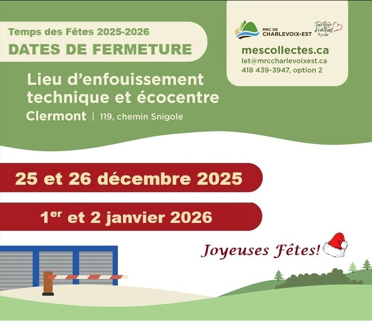 Depuis 2002, la MRC de Charlevoix-Est a compétence sur tout son territoire en gestion des matières résiduelles (GMR) et son objectif est de valoriser le maximum de matières résiduelles sur le principe des 3RV-E (réduction, réemploi, recyclage, valorisation et enfouissement). Ainsi, seuls les déchets ultimes sont enfouis au Lieu d’enfouissement technique (LET) situé Clermont.